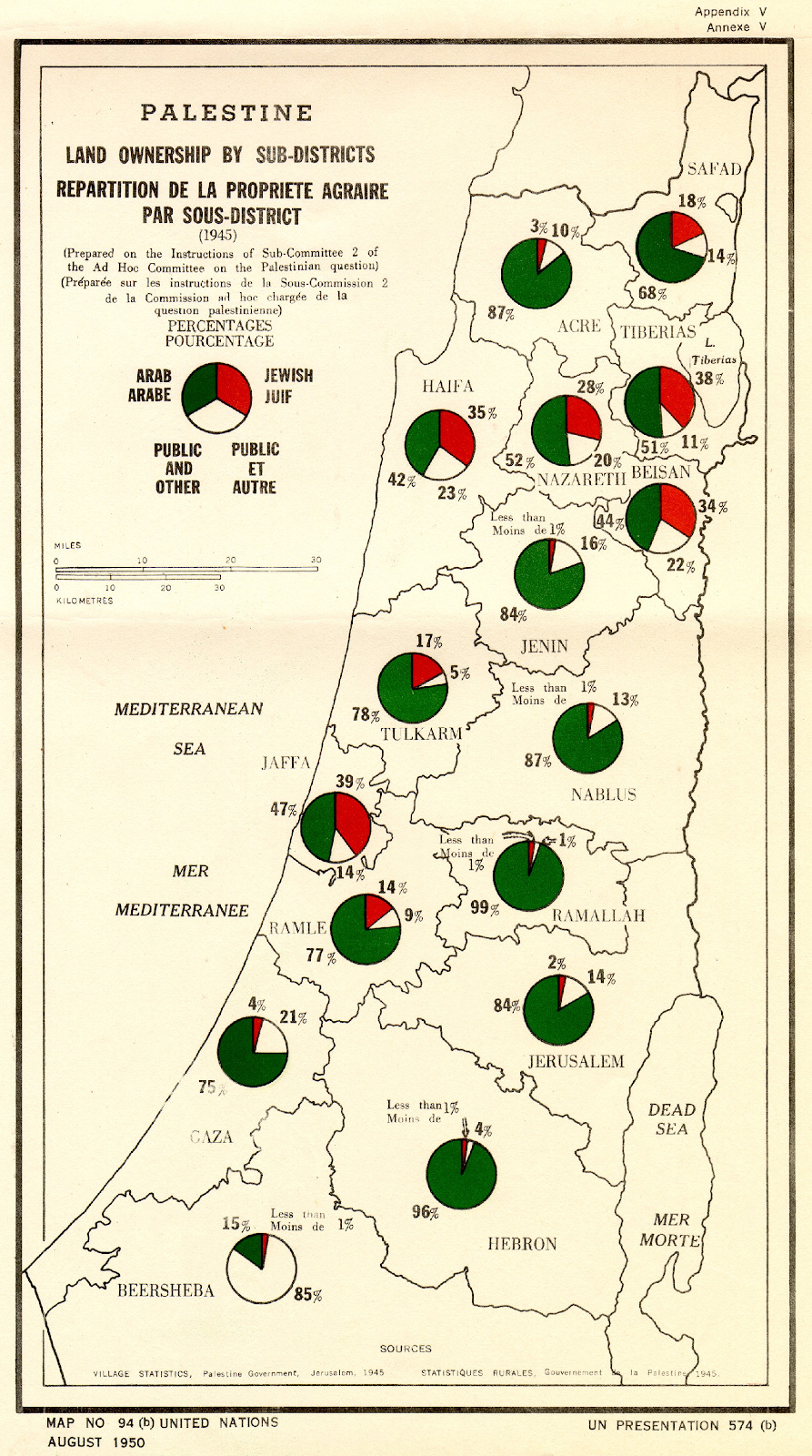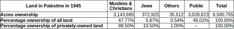 In 1945, the British mandate government surveyed land ownership in Palestine and found that Jews owned 5.67% of the total land, while Muslims, Christians & other denominations owned 48.31% of the land. The remaining 46.02% was public land, mainly in the sparsely inhabited desert in the south, most of which was de facto owned by the Bedouins who herded there. Among the privately-owned lands, only 10.5% was owned by Jews, while 89.5% was owned by non-Jews. There was not a single district in Palestine in which Jews owned a majority of the land, as this illustration makes clear.[1]